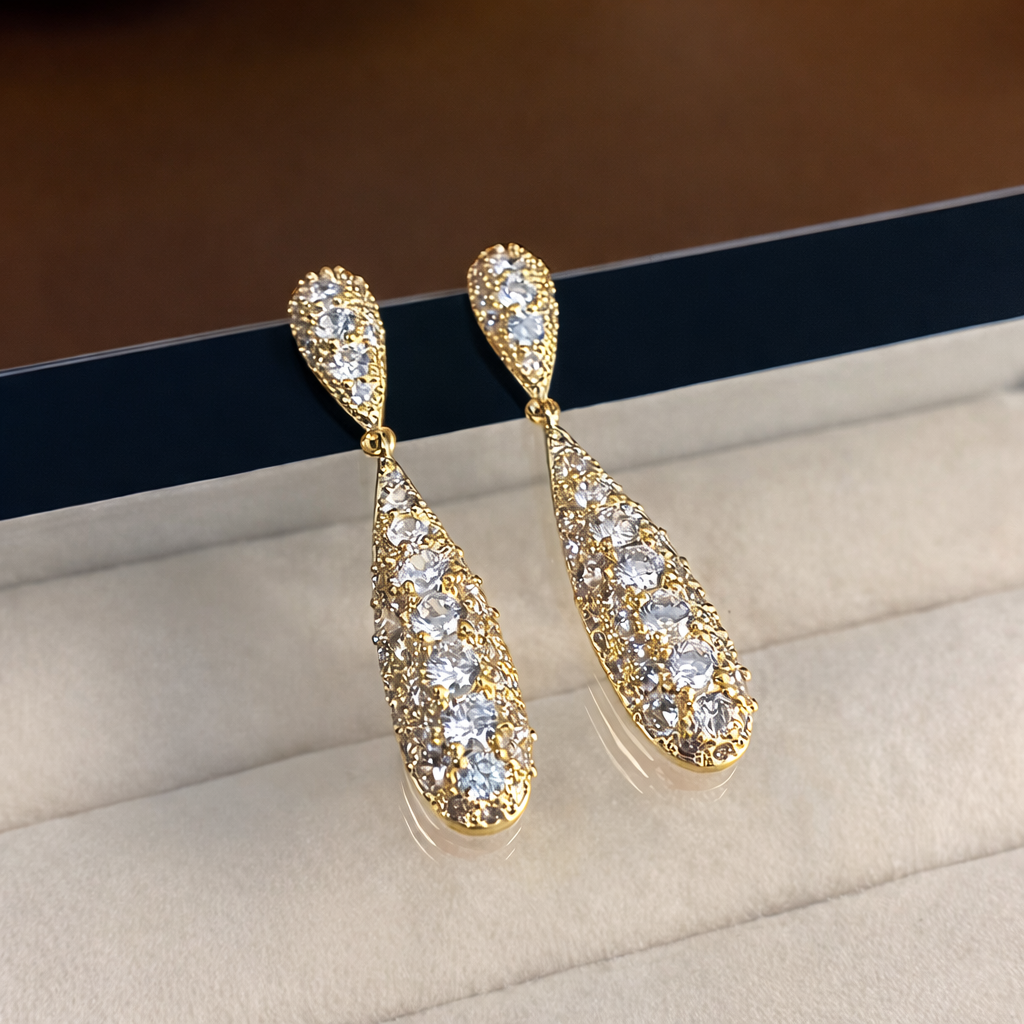 The double-tier design features a delicate pave-set teardrop stud flowing into a gracefully elongated teardrop drop, both lavishly embellished with premium crystal stones that catch and refract light with mesmerizing brilliance. The lustrous 18K gold tone finish is flawlessly applied, delivering a rich, radiant glow that rivals much more expensive pieces.